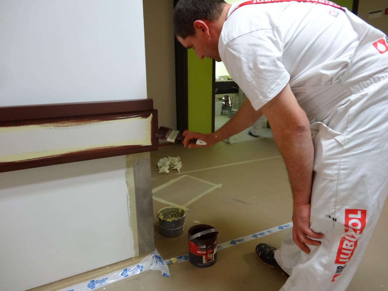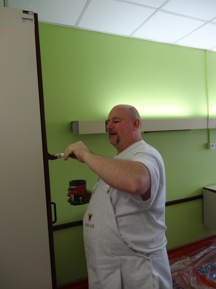 Pri obdelavi sten morajo najprej zaščititi tla, podboje in okenske okvirje, zatem pa obdelati razpoke, zbrusiti površine, premazati podloge sten in radiatorjev ter obdelati lesene obloge in ograje. Nato sledi priprava barve ustrezne viskoznosti v zahtevanem odtenku, ki so jo za vsako sobo posebej v svoji barvni študiji določili JUB-ovi arhitekti, pri čemer so seveda upoštevali želje osebja bolnišnice. Sledi nanos premaza in po končanju del še dokončno čiščenje prostora.