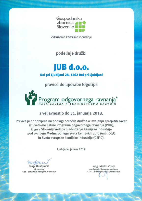 Družba JUB je tudi letos prejela certifikat Programa odgovornega ravnanja in s tem pravico do uporabe logotipa POR za leto 2017. Certifikat je podjetjem, ki so pristopila k Programu odgovornega ravnanja, na krajši slovesnosti podelil generalni direktor CEFIC g. Marco Mensink.
